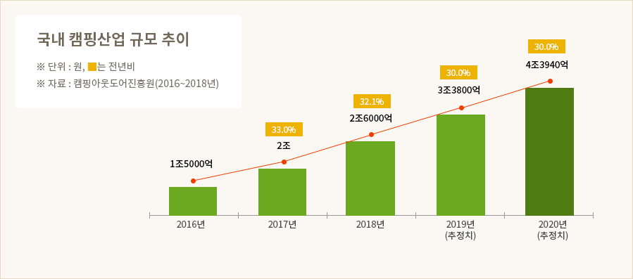 소득수준에 맞춰 발전하는 것이 일반적이며 선진국형 아웃도어의 하나인 캠핑이 1인당 GDP 2만 달러에서 3만 달러로 넘어가는 시기에 캠핑 인구가 급증하며 성장하고 있다.